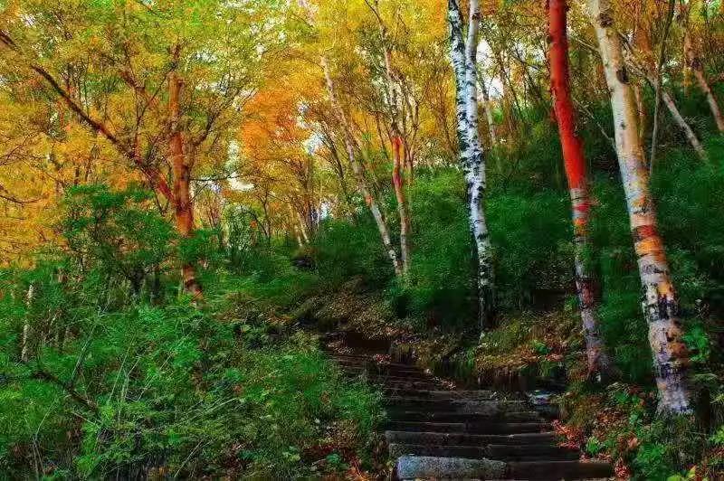 車行在蜿蜒平坦的山路上,越往山中行,涼意越發(fā)明顯。漫山的茂林慢慢退去青翠,換上的是綠中帶黃,黃中夾雜著紅的奇妙景色,就像打翻了顏料盒,每個角度都是風(fēng)光旖旎的畫卷。