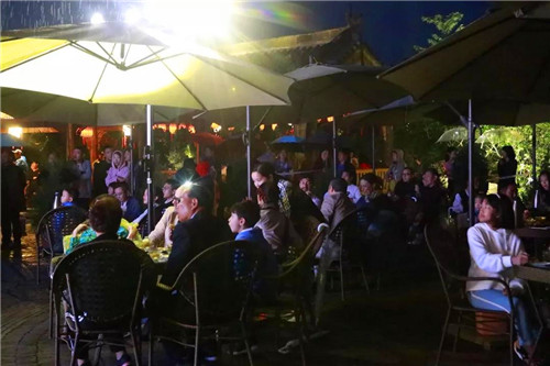 夜晚的王屋老街流光溢彩,夜色醉人。旅行團(tuán)一行在老街戲臺(tái)聽(tīng)?wèi)蚩囱莩觯凡栀p月觀夜景。