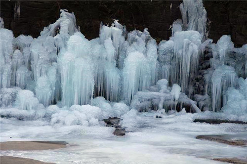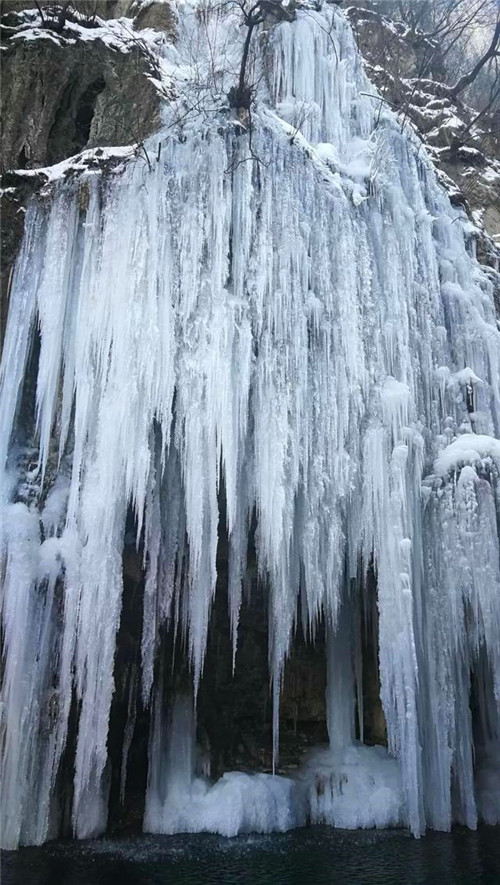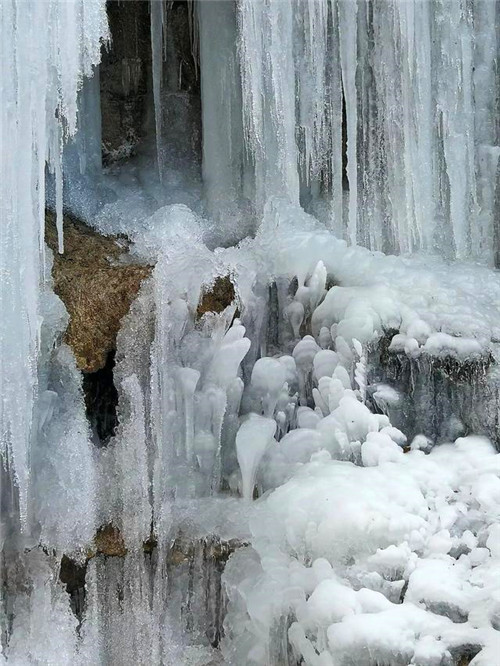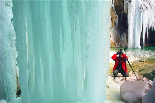 時間似水而逝,當(dāng)瀑布已經(jīng)凍結(jié),不知時間是否停滯,只知美麗已經(jīng)凝結(jié)。峽谷間大大小小的冰瀑,凝結(jié)成冰柱、冰筍、冰菇,懸掛在峭壁上,一團團,一簇簇,晶瑩剔透,美艷動人。