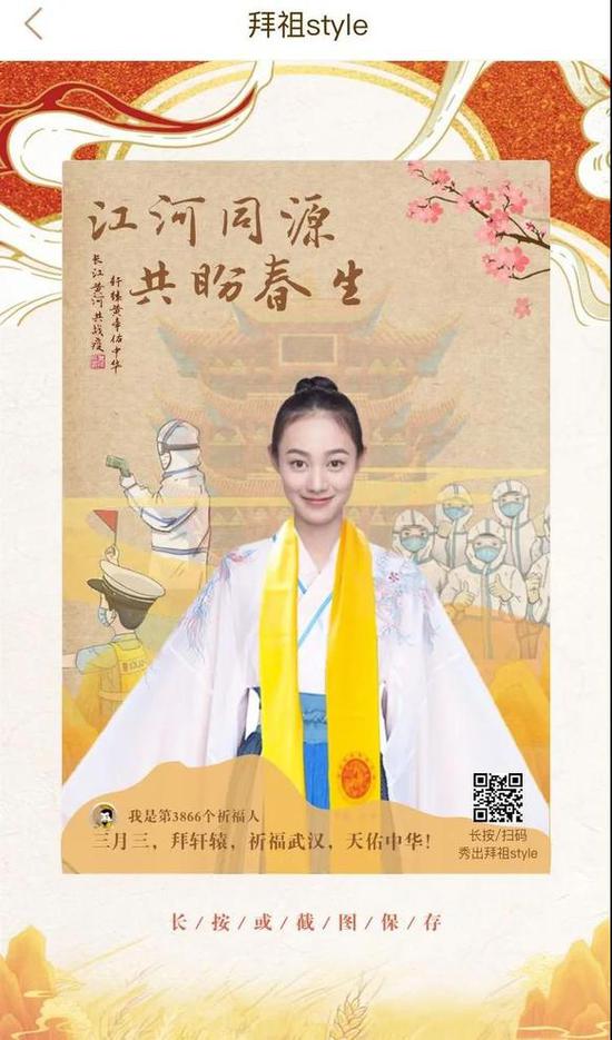 網(wǎng)友為“祈福黃金樹”添葉成功后,就能領(lǐng)取虛擬版的“黃帝祈福絲巾”。這時將自己的照片上傳平臺,就會產(chǎn)生一張帶黃絲巾且有“加油武漢”、“祈福中華”、“華夏安瀾”等祈福語的照片,當保存成功后就可曬在朋友圈中,在微信上為中國加油。