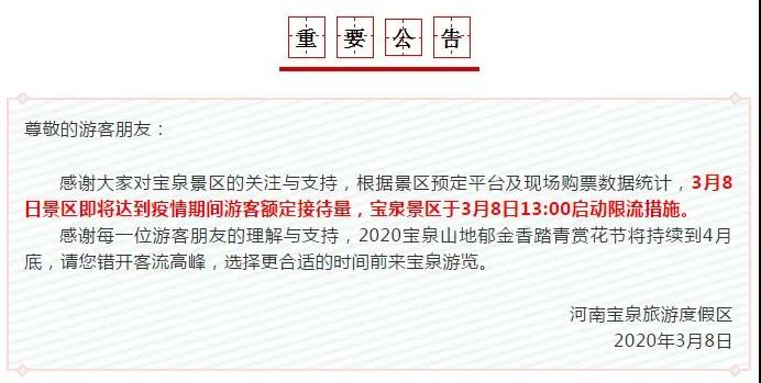 3月8日中午時(shí)分,寶泉景區(qū)入園游客出現(xiàn)瞬時(shí)高峰,造成短暫擁堵,引發(fā)廣大網(wǎng)民熱議。面對(duì)此種情況,寶泉景區(qū)當(dāng)日及時(shí)發(fā)布通告,對(duì)大家?guī)?lái)的擔(dān)憂,深表歉意,并誠(chéng)懇接受大家的意見和建議,隨即啟動(dòng)應(yīng)急預(yù)案及“硬核”整改措施,力保景區(qū)游客游覽安全。