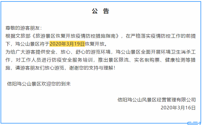 根據(jù)文旅部《旅游景區(qū)恢復(fù)開放疫情防控措施指南》,在嚴(yán)格落實(shí)疫情防控工作的前提下,雞公山景區(qū)將于2020年3月19日恢復(fù)開放。