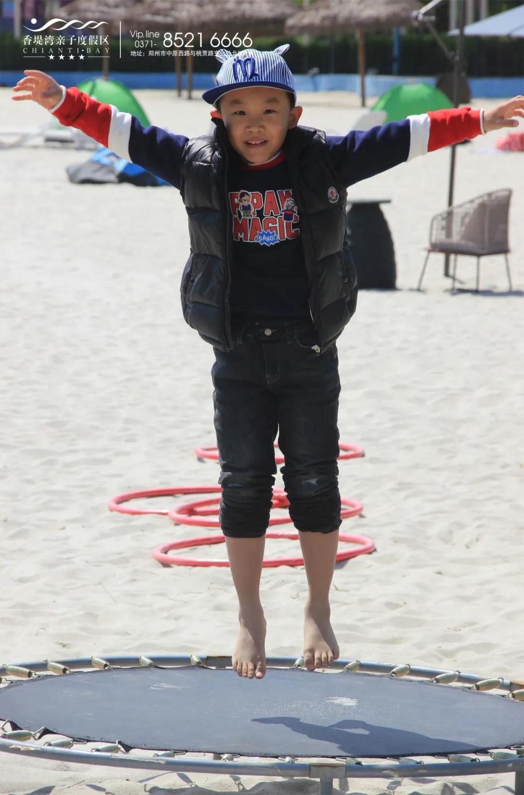 沙灘上配有的大片自由蹦床,熊孩子們第一眼就無法控制自己,站在上面輕輕一蹦分分鐘離開地球表面,借助騰空時間,360°隨心所欲凹造型。