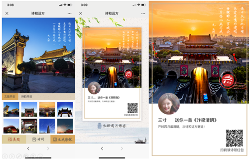 領(lǐng)取完紅包還沒有結(jié)束哦,您還可以選擇自己喜歡的詩作,將詩詞與開封美景真實(shí)場景相匹配,一詩一景,跟著詩詞去旅行,生成一份詩韻開封的“詩和遠(yuǎn)方”明信片,保存至相冊并分享朋友圈,邀請更多親朋好友參與,分享你的讀詩樂趣。
