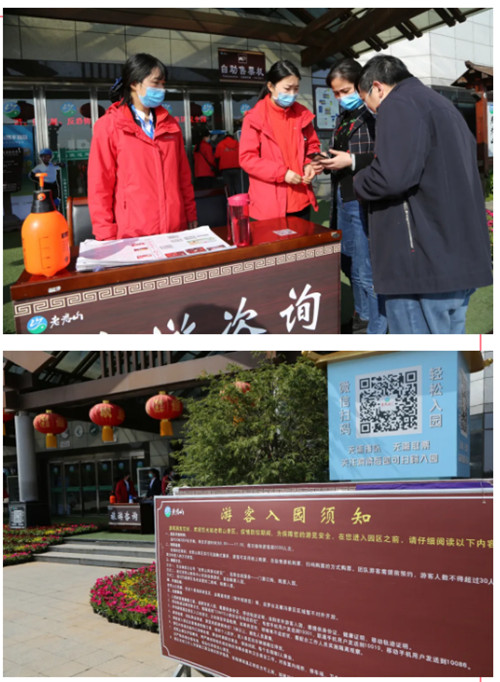 老君山景區(qū)嚴格按照洛陽市防疫指揮部的要求,實行了一系列的防疫措施,員工必須佩戴口罩上崗,入園游客需佩戴口罩。在景區(qū)售票處,實行無接觸購票服務,游客可通過自助售票機自行購票。