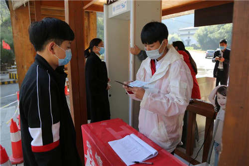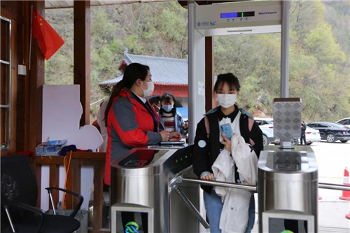 在景區(qū)檢票處,游客需提供健康證、健康碼、測量體溫正常后方可入園。