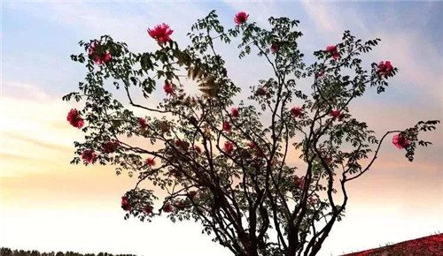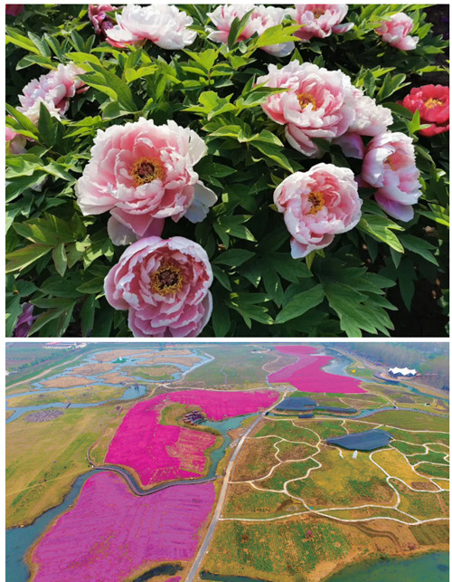 兩株千年牡丹花開正艷、絢麗多彩,陣陣花香沁人心脾令人陶醉,從空中俯瞰,五顏六色的牡丹花次第開放,妖嬈的花朵掩映在綠色的枝葉中,一團(tuán)團(tuán),一簇簇,可謂“百花”齊放、香氣四溢。