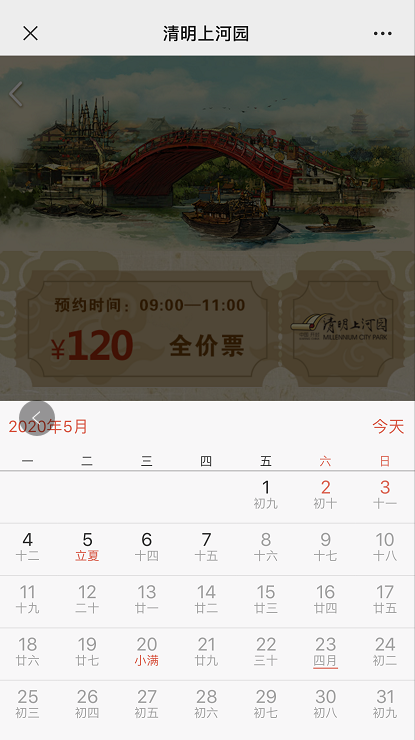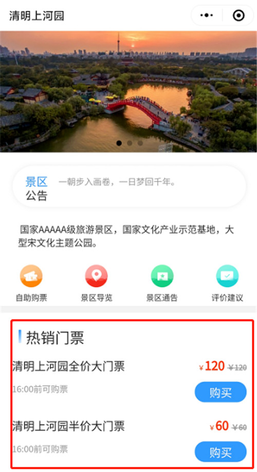 進入清明上河園小程序主頁面,根據(jù)需求點擊清明上河園全價票/半價票。