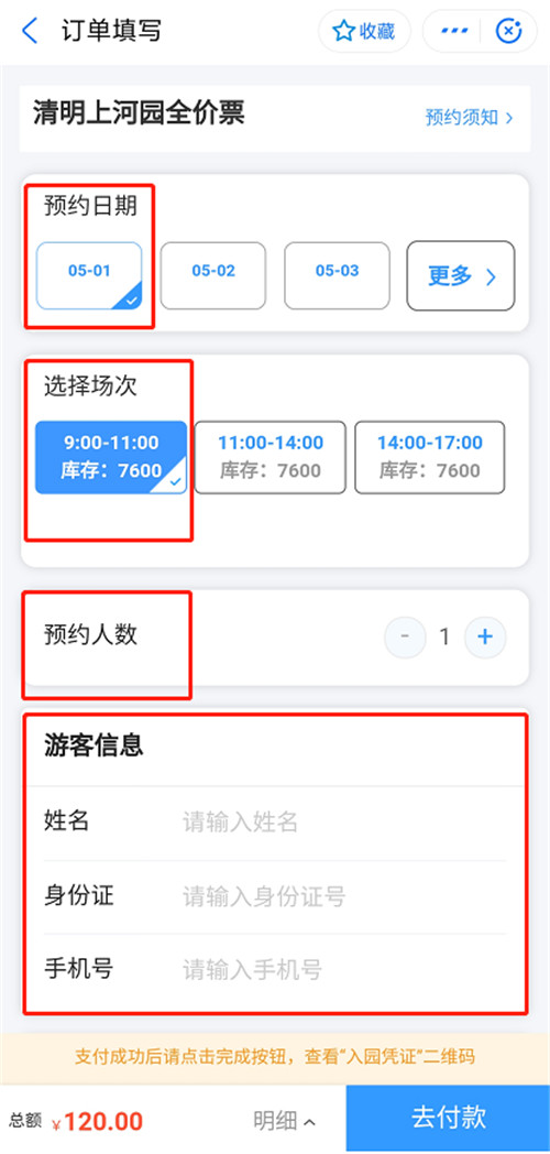 選擇您要預約的時間(點擊“更多”顯示更多日期),選擇入園時間段,預約人數(shù),輸入購買人身份信息(一定要在您預約的入園時間段入園噢)。