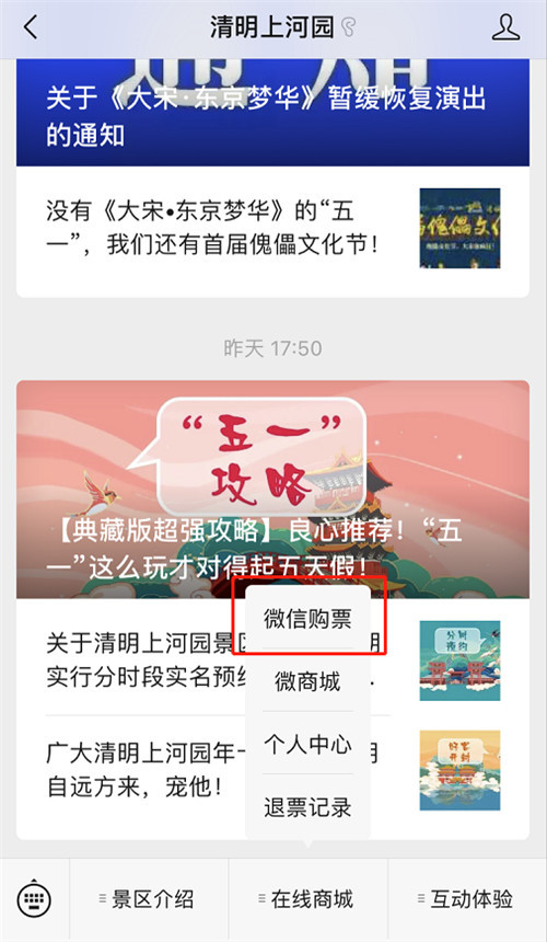 搜索“清明上河園”公眾號,點擊“微信購票”。