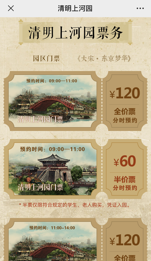 進入購票頁面,根據(jù)需求點擊清明上河園全價票/半價票。