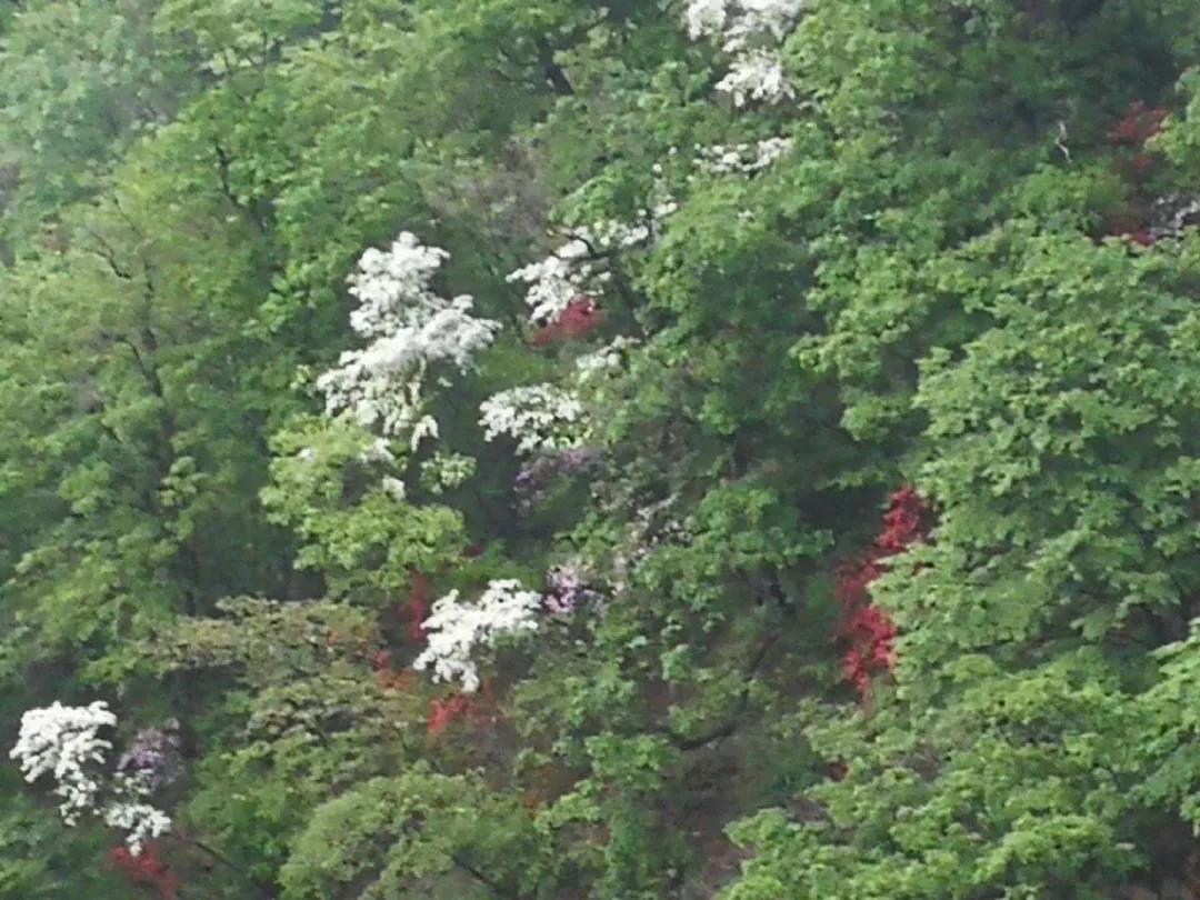 約上七八個好友,兩臺車自寶天曼寶天賓館向上蜿蜒而行。群山環(huán)翠,萬木濃綠,富氧離子自窗外涌入,清新脫俗之意油然而生。萬綠叢中一棵棵,一片片嫣紅,深紅,銀白,亮紫的杜鵑時而閃現,令人心會意喜。