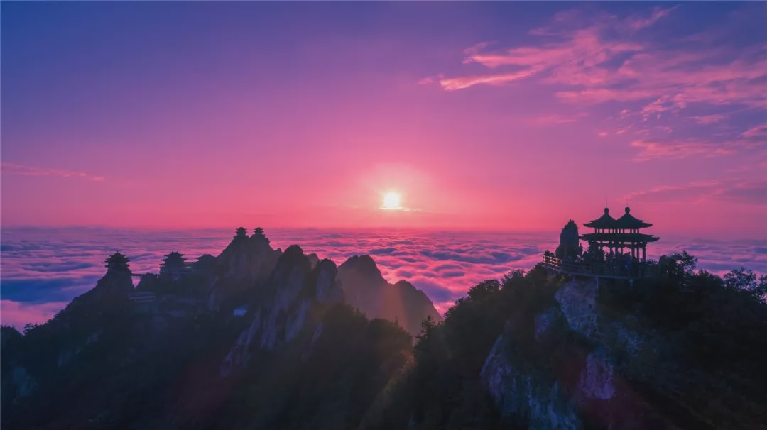 站在亮寶臺(tái)位置,以西邊玉皇頂為前景參照物拍日落。此位置適合拍云海、星軌、金殿、縣城、起伏的山巒,老君山最高峰——馬鬃嶺。