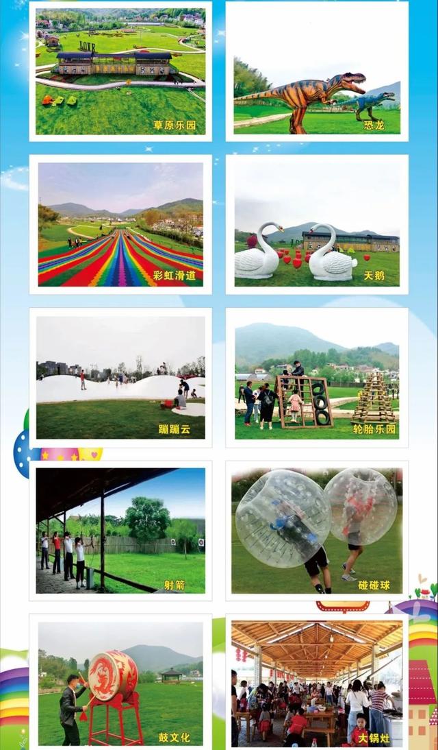 彩虹滑道、射箭、碰碰球、蹦蹦云、大鍋灶、輪胎樂園等各種親子游玩項(xiàng)目的草原親子樂園。