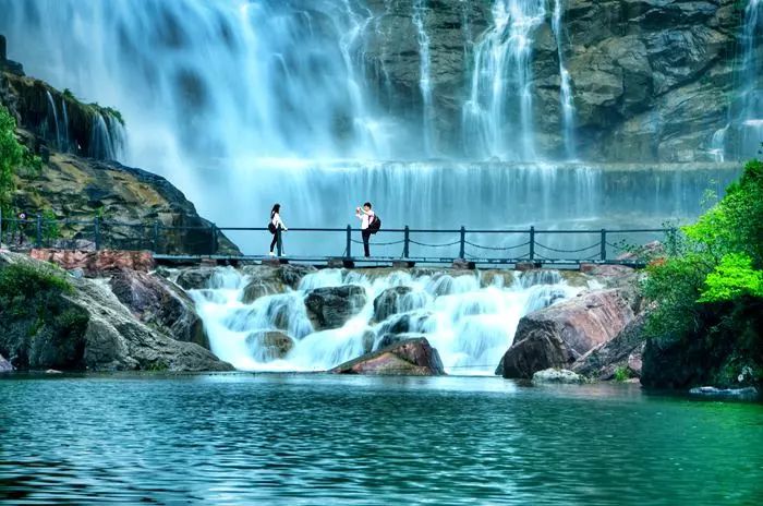 一大一小兩股瀑布自山間而下,匯聚成一股,水流清澈、水質(zhì)極佳。傳說(shuō)用這里的水洗臉勻面,能求得一段好姻緣,所以頗受單身人士的喜愛(ài)。來(lái)關(guān)山還可和你愛(ài)的人在天柱峰扣上一枚同心鎖,許下愛(ài)的誓言。