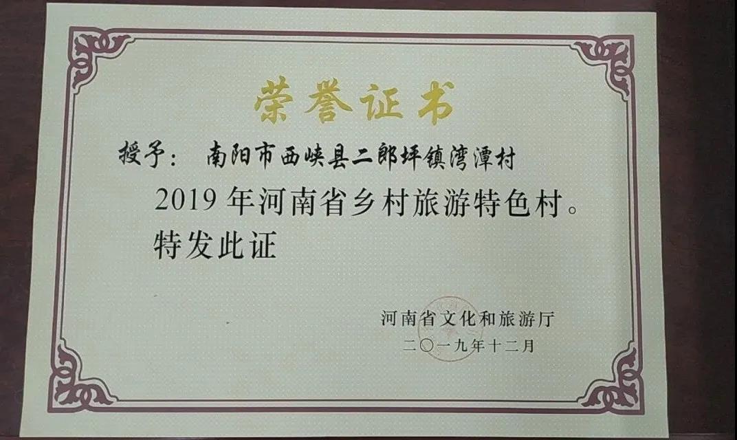 依托山清水秀的自然環(huán)境,灣潭村建起占地幾十畝的鄉(xiāng)村農耕文化苑,與附近的農家樂一起,初步形成景點、農家樂、休閑游,深層次旅游鏈條。河南省文化文化旅游廳授予二郎坪鎮(zhèn)灣潭村,“2019年河南省鄉(xiāng)村旅游特色村”的稱號。