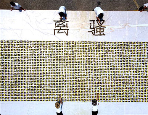 據(jù)悉,《離騷》全文2800余字,再加上遠(yuǎn)山等圖案,他們一共用去槲包3000余枚花費(fèi)5個(gè)多小時(shí),繪制出了粽子版《離騷》,用這種傳統(tǒng)文化結(jié)合傳統(tǒng)節(jié)日的方式,在傳統(tǒng)節(jié)日弘揚(yáng)愛國(guó)情懷,迎接端午節(jié)的到來。
