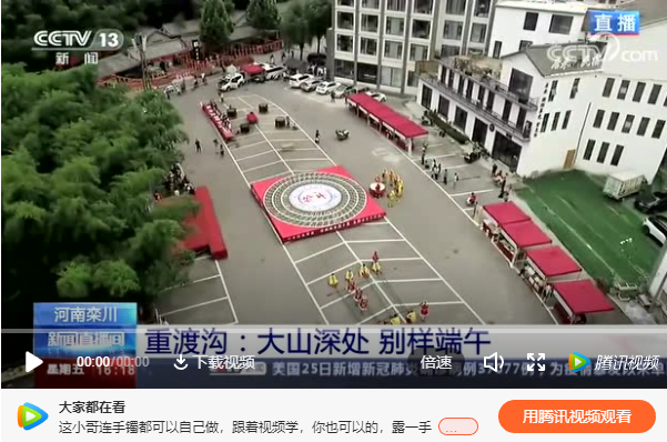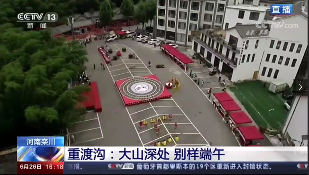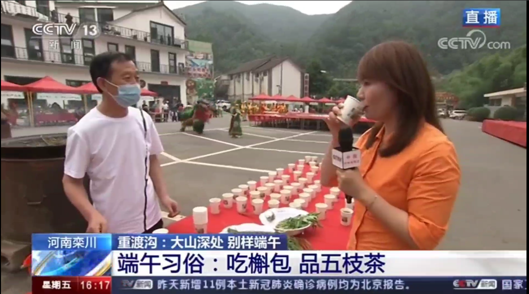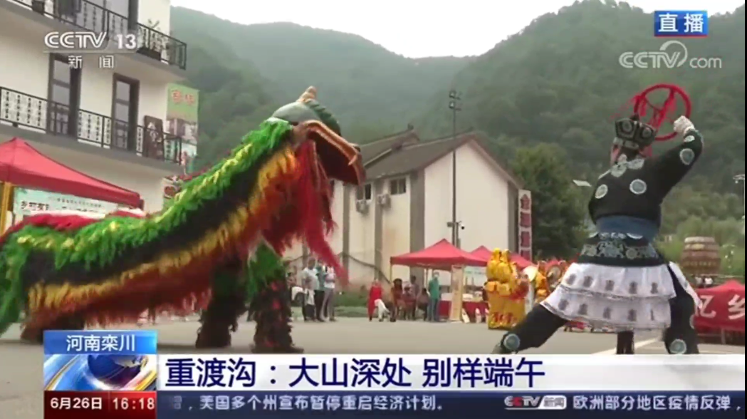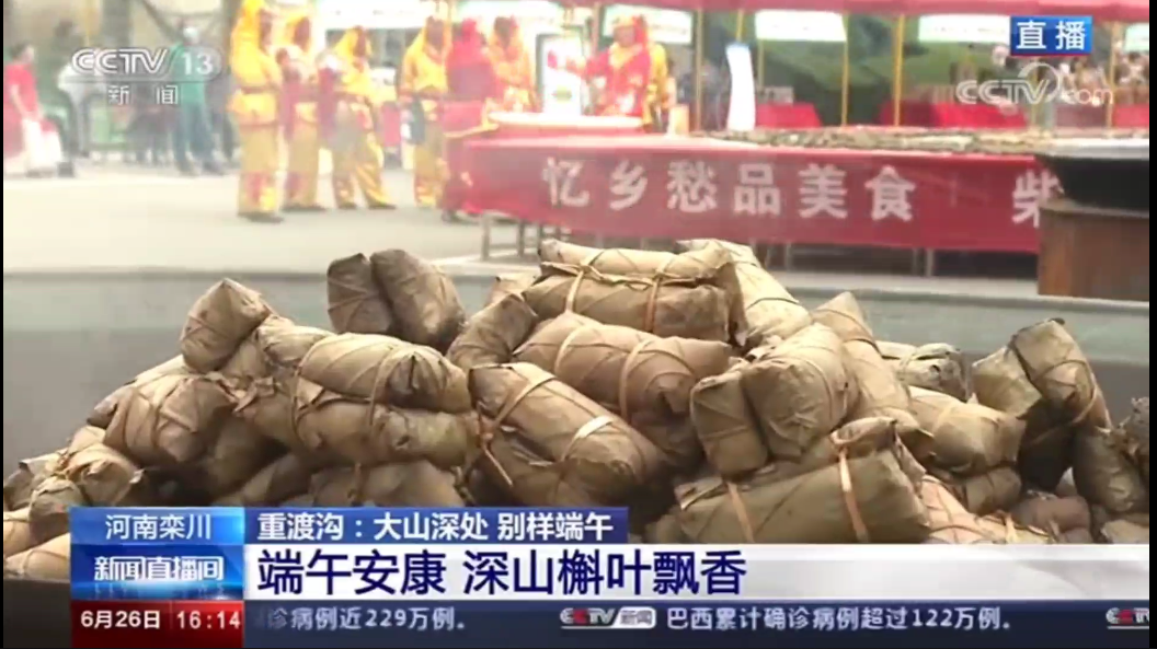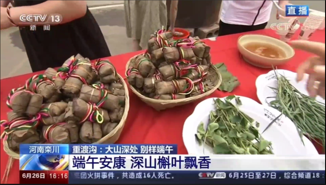 6月26日下午4點(diǎn),CCTV13央視新聞頻道現(xiàn)場播報(bào)重渡溝:大山深處 別樣端午。吃槲苞品五枝茶賞獨(dú)角獸表演 重渡溝里過端午。端午節(jié)全國各地都會吃粽子,南方賽龍舟,但是河南洛陽欒川的特別之處是吃槲苞,欒川人用家鄉(xiāng)大山上的槲樹葉,包上秫米、紅小豆、蜜棗加工成香噴噴的槲包,清香怡人。