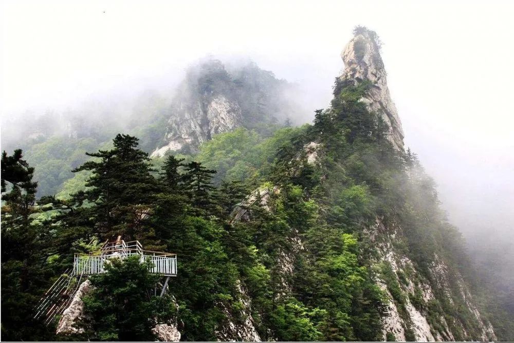 走在飛云棧道上,可以親身體驗“人在云中游,景隨霧中飄”的神奇之美。一條通路下來可以觀群仙聚會、猴子拜觀音、大將軍、二將軍、蓮花峰、駱駝峰等各種形狀迥異的山林怪石。飛云棧道位于堯山索道的上站處,此路直接通往我們堯山的最高點(diǎn)——主峰玉皇頂。