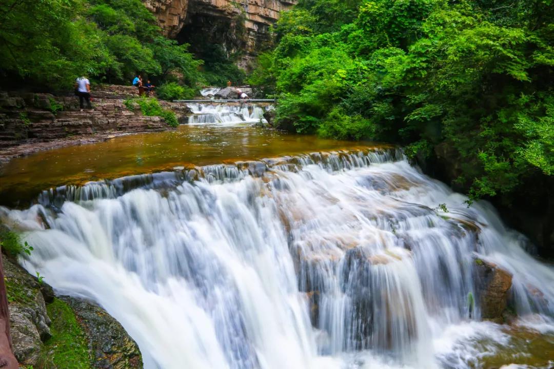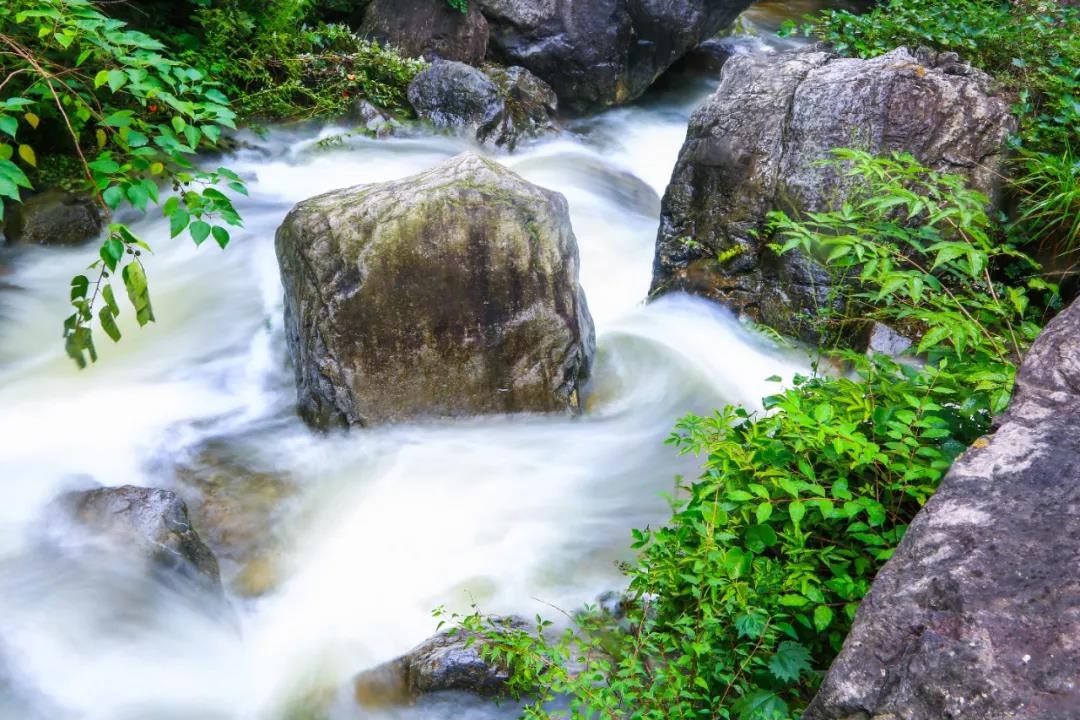 潭瀑峽谷內(nèi)風(fēng)光怡人,宛若江南,三步一泉,五步一瀑,溪潭相依,泉瀑爭(zhēng)流,這些瀑布隨著錯(cuò)落的巖層落下,似錦帶、似流云、似白龍,靈秀靈動(dòng),渾然天成。