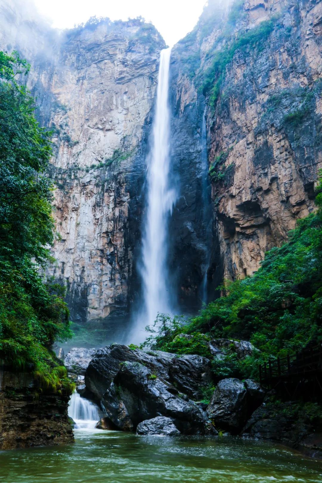 “山因水而靈動,水有山而飄逸”,位于泉瀑峽盡頭的云臺天瀑,峰高瀑急,單級落差高達314米,豐水期的云臺天瀑,宛若銀河飛落,猶如擎天玉柱,蔚為壯觀。