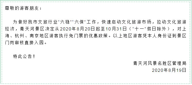 為做好焦作市文旅行業(yè)“六穩(wěn)”“六保”工作,快速啟動(dòng)文化旅游市場(chǎng),拉動(dòng)文化旅游經(jīng)濟(jì),青天河景區(qū)決定從2020年8月20日起至10月31日(“十一”假日除外),對(duì)上海、杭州、南京地區(qū)游客執(zhí)行免門票的優(yōu)惠政策。