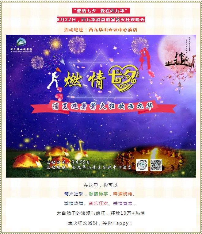 八月,最讓人期待的七夕節(jié) 又要到了!。∠牒谜^了嗎?沒想好的話,來西九華山吧,這里消夏避暑篝火狂歡晚會即將火爆開啟,趕快與心愛的“ta”約起來!