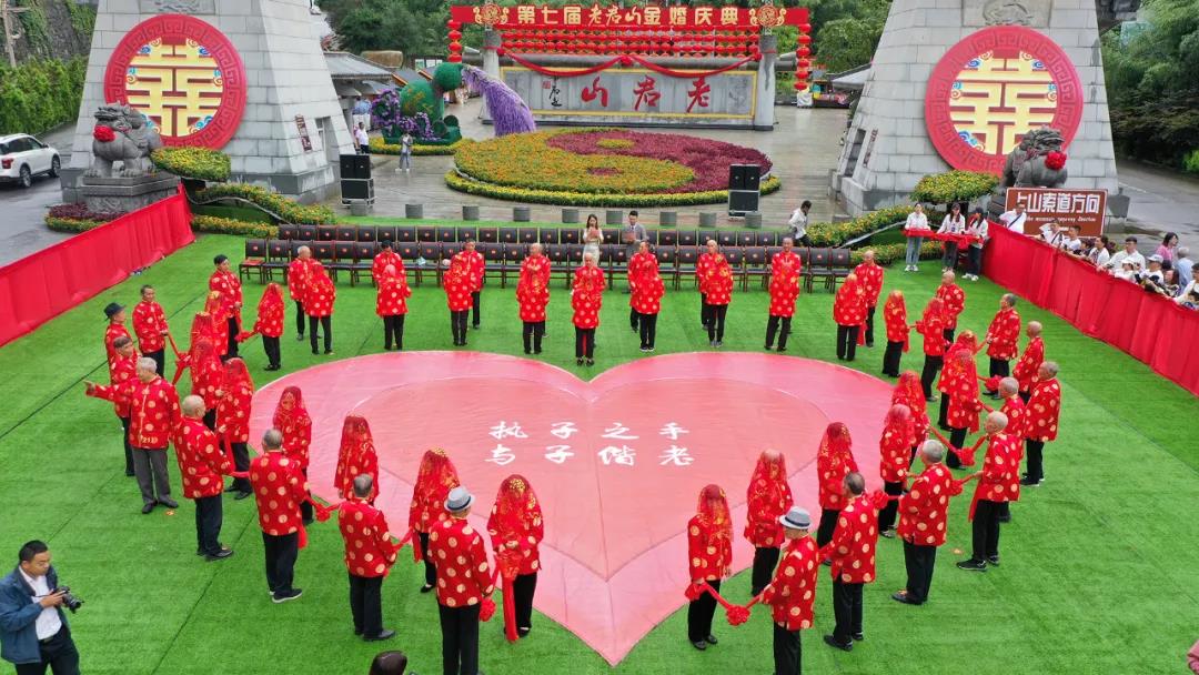 圖:8月22日,老君山第七屆金婚慶典活動現(xiàn)場。28對金婚老人擺出金婚“心”字造型。