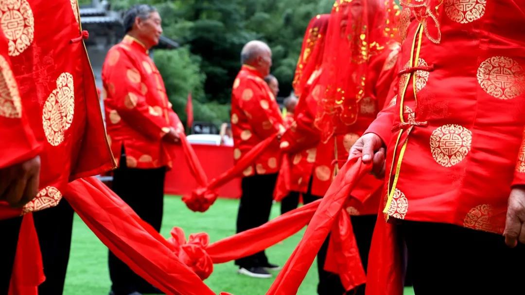 龍飛鳳舞結良辰,夫妻對拜喜盈門。中式慶典現(xiàn)場,老人為老伴蓋上紅蓋頭,金婚老人相對而立,相互對拜。
