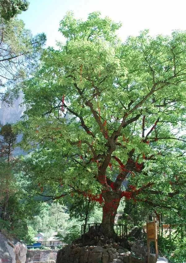 在八里溝紅石河有一棵頑強生長的樹,那便是一棵生長在一千多米的懸崖邊的古麻櫟樹。樹齡在1300年之上,樹根之處分為兩杈,兩根樹干枝葉環(huán)抱,互相偎依。好像兩個親密的愛人不離不棄,相依為命,故叫百年好合樹。來此觀光的情侶都會祈福祝禱,單身的人會掛福帶求姻緣。