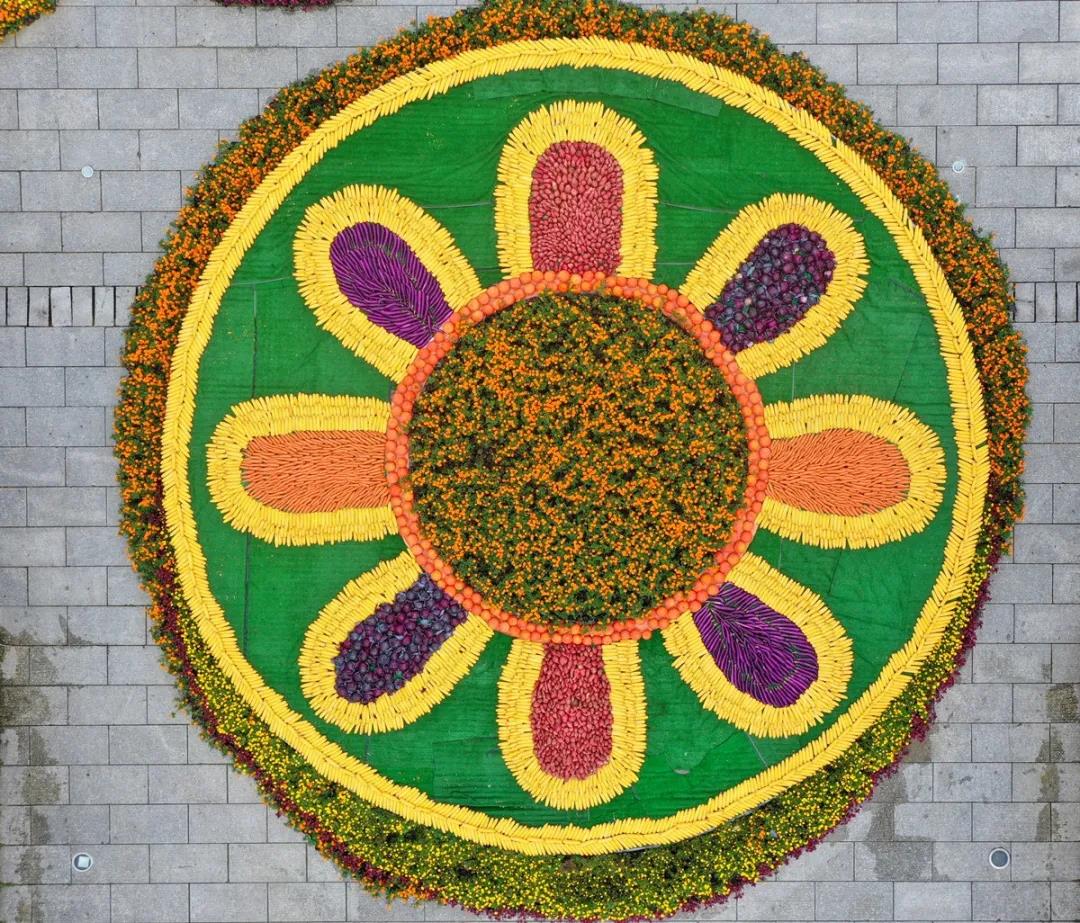 看過地質(zhì)廣場的花樣造景,再沿景區(qū)入口來到平陽廣場,濃烈的豐收氛圍瞬間展現(xiàn)在游客眼前,抬眼望去,堆積成群的農(nóng)作物及南瓜、茄子、胡蘿卜、紅薯等琳瑯滿目的各類農(nóng)產(chǎn)品組成一個巨型果盤,讓人大飽眼福。