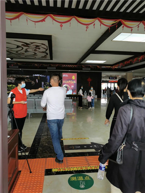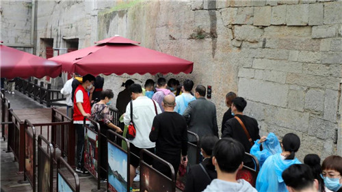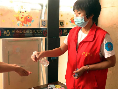 游客來到芒碭山,在入園以前需會通過紅外攝像進(jìn)行體溫測量、出示健康碼、手部消毒等工作;景區(qū)還設(shè)置有大量引導(dǎo)人員,用以提醒廣大游客注意自我防范,包括與他人小于1米距離接觸時規(guī)范佩戴口罩、打噴嚏時注意遮擋等新冠防范知識科普內(nèi)容;對服務(wù)游客的公共設(shè)施進(jìn)行定時消殺,每間隔1小時進(jìn)行集中處理。