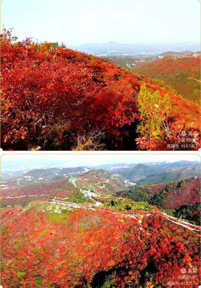 在陽(yáng)光的照耀下,猶如一團(tuán)團(tuán)的火焰在燃燒,朝霞初照,像落在山腰的紅云,晚霞輝映,又像一團(tuán)團(tuán)紅瑪瑙,中國(guó)紅,早已成為了秋天長(zhǎng)壽山的神韻與底色,這里有熱烈,也有詩(shī)意與浪漫,讓你邂逅醉美的風(fēng)景。