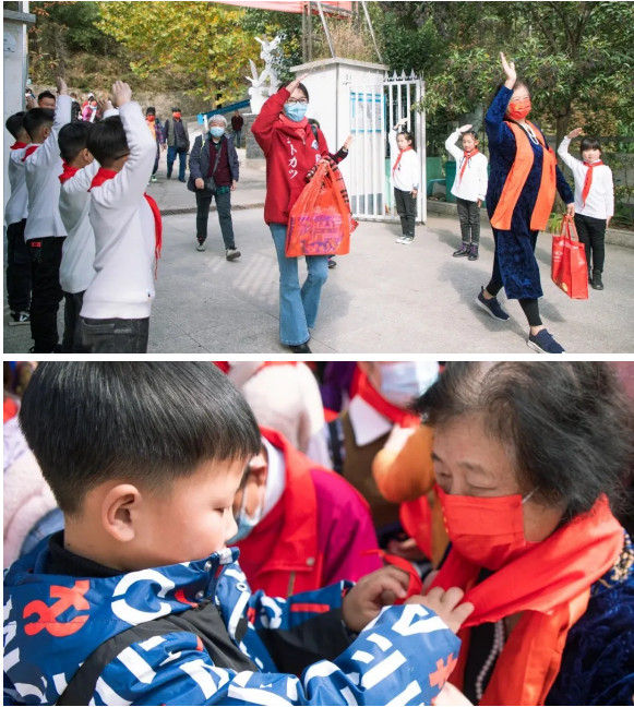 數(shù)百件學(xué)習(xí)用品,從爺爺奶奶們的手中傳遞到卡房村小學(xué)的學(xué)生手上。孩子們臉上洋溢著開(kāi)心的笑容,他們也為遠(yuǎn)道而來(lái)的爺爺奶奶們帶上紅領(lǐng)巾,表達(dá)了自己的敬意。