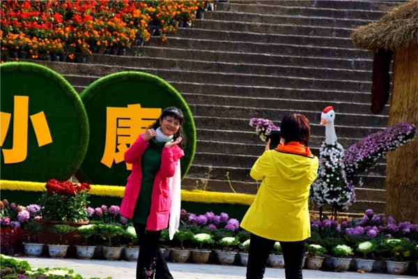 景區(qū)中心廣場,精美的菊花造型、醉人的豐收場景,使得游人流連忘返!
