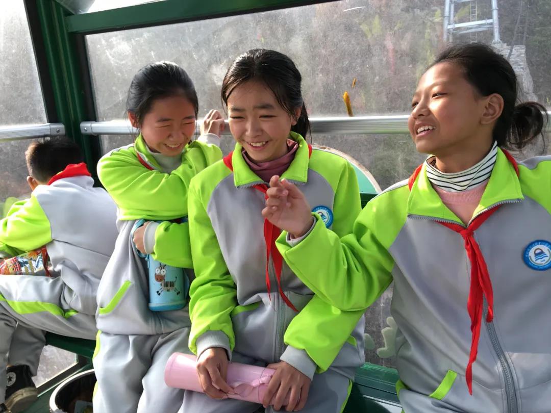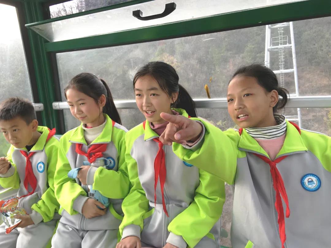行駛在海拔1500米的空中,吊廂中的同學(xué)們露出各種吃驚的表情,以此來表達(dá)對(duì)轎頂山研學(xué)基地美景的贊許。