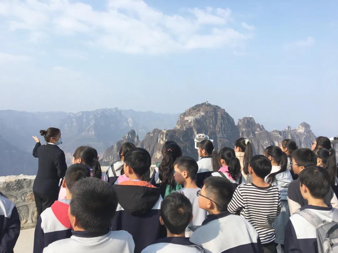 在海拔1601米觀景臺(tái)上,同學(xué)們一腳跨河南、山西兩省,臨欄遠(yuǎn)眺,轎頂山、萬仙山、王莽嶺三景奇觀盡收眼底;三百六十度全景觀太行!實(shí)地了解了南太行山的斷層山脈地形地貌與掛壁公路奇觀,以及萬仙山,王莽嶺等具體位置。