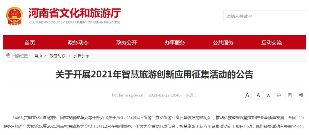 1月22日,河南省文化和旅游廳官網(wǎng)發(fā)布公告,為深入貫徹文化和旅游部、國家發(fā)展改革委等十部委《關(guān)于深化“互聯(lián)網(wǎng)+旅游”推動(dòng)旅游業(yè)高質(zhì)量發(fā)展的意見》,推動(dòng)科技成果賦能文旅產(chǎn)業(yè)高質(zhì)量發(fā)展,全國“互聯(lián)網(wǎng)+旅游”發(fā)展論壇暨2021河南智慧旅游大會(huì)擬于3月12日在鄭州舉辦。作為大會(huì)重要組成部分,智慧旅游創(chuàng)新應(yīng)用征集活動(dòng)即日啟動(dòng),全國范圍內(nèi)文旅單位、通信運(yùn)營商、互聯(lián)網(wǎng)企業(yè)和科技公司等均可參與應(yīng)用征集。