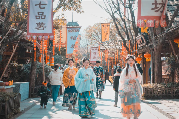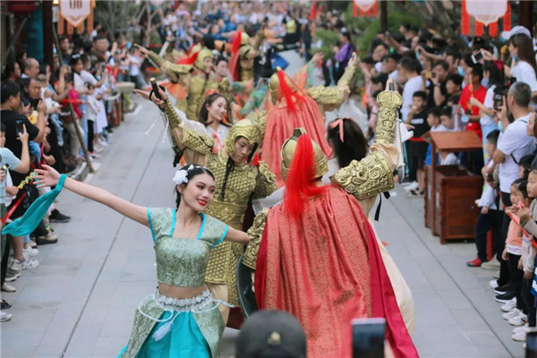 伴隨著鏗鏘有力的鑼鼓聲,一對(duì)活靈活現(xiàn)的舞獅,跳躍、登高、走樁……穿越千年,踏步而來,醒獅鬧春,舞出紅紅火火的中國(guó)年。在彤燈盞盞的長(zhǎng)街古巷,游客與錦繡華裳的舞者們,一起祈福巡游,許下新年心愿。動(dòng)感的音樂、魔性的舞姿,滿園子的游客和演員,一起瘋一起玩一起載歌載舞,共赴一場(chǎng)穿越千年的盛宴。