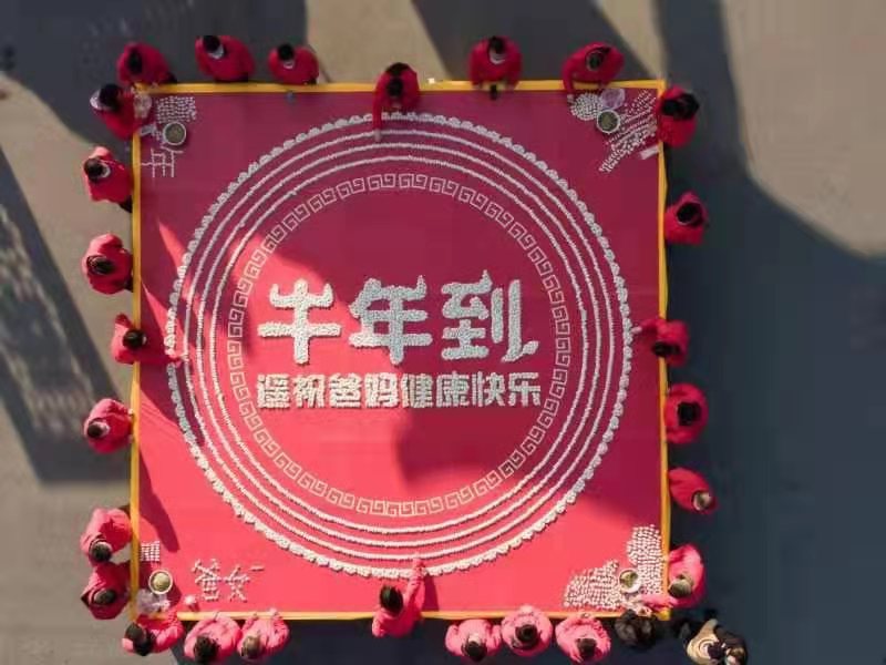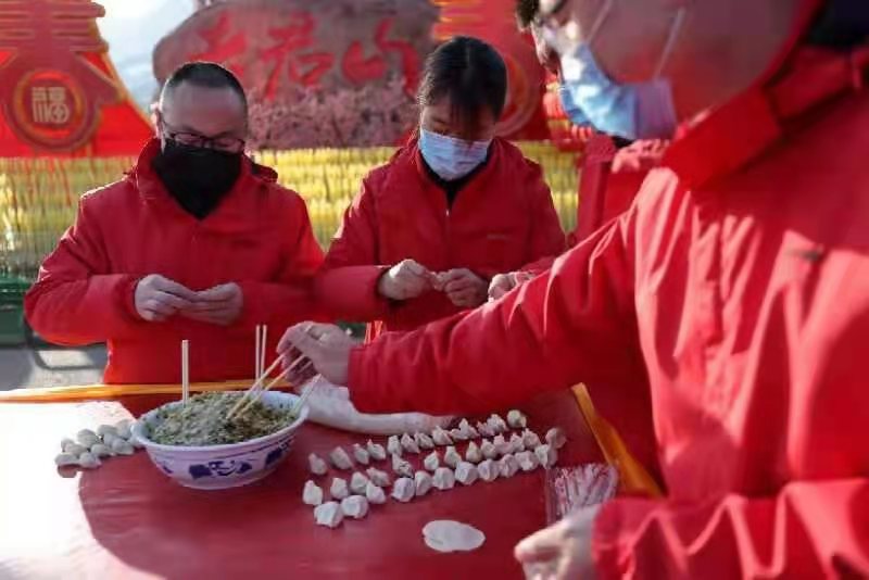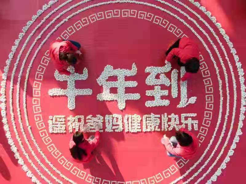 在河南欒川老君山,就地過年的外地員工與同事們一起包餃子,并將這些餃子認真的組成一個圓形的心愿水餃圖,隔空遙祝遠在家鄉(xiāng)的父母“健康快樂”,同時,他們也祝愿所有就地過年的打工者,祝福他們的父母都能健康快樂,也愿全國的父母們都平安幸福。