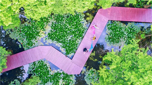 您和家人自駕亦或乘車(chē),一路悠然前往雞公山。可在停車(chē)場(chǎng)乘坐游覽觀光車(chē)(亦可步行)前往逍夏園,看造型別致的馬歇爾樓、別具一格的丹麥樓,賞風(fēng)景如畫(huà)的月湖,走一走網(wǎng)紅玻璃橋,在清涼宜人的木棧道上合張影。