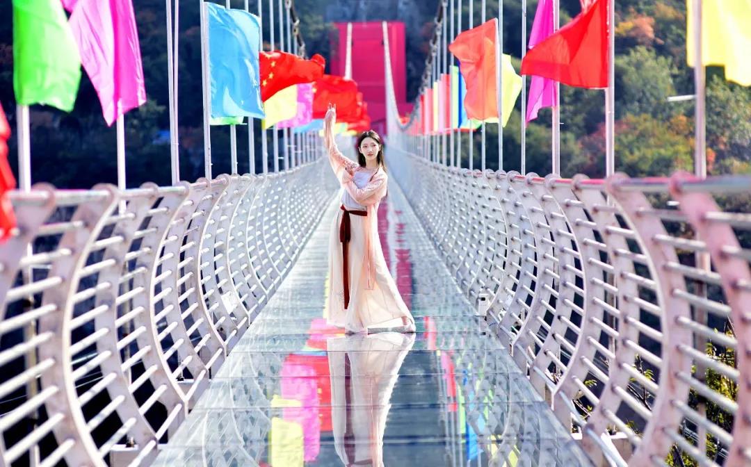走在九峰山高空玻璃橋上,俯視腳下的山谷,眺望遠(yuǎn)方的山巒,和家人朋友攜手享受著愜意的假期生活,臉上洋溢著幸福。