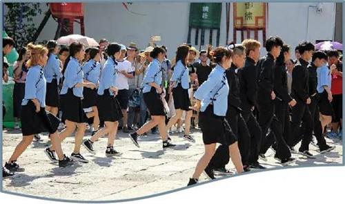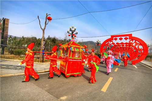 我國(guó)傳統(tǒng)的民間婚俗,喜慶而熱鬧。我們將信陽(yáng)民間迎親的場(chǎng)面,匯集到南街小廣場(chǎng),有信陽(yáng)民間的《秧歌舞》、《花傘舞》、《板凳龍》和民國(guó)風(fēng)情的送親隊(duì)伍,展現(xiàn)了迎新娘《過彩橋》、《鬧洞房》的熱鬧場(chǎng)景。