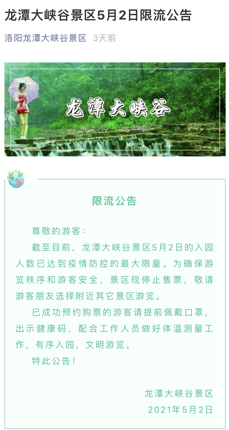 為認(rèn)真做好“五一”假日期間的疫情防控和保護(hù)、管理、服務(wù)等工作,景區(qū)嚴(yán)格按照疫情防控要求,查看健康碼、檢測(cè)體溫、實(shí)名登記和防疫消殺。并在5月2日根據(jù)疫情防控的相關(guān)規(guī)定,發(fā)布限流公告,暫停售票保障游客安全。