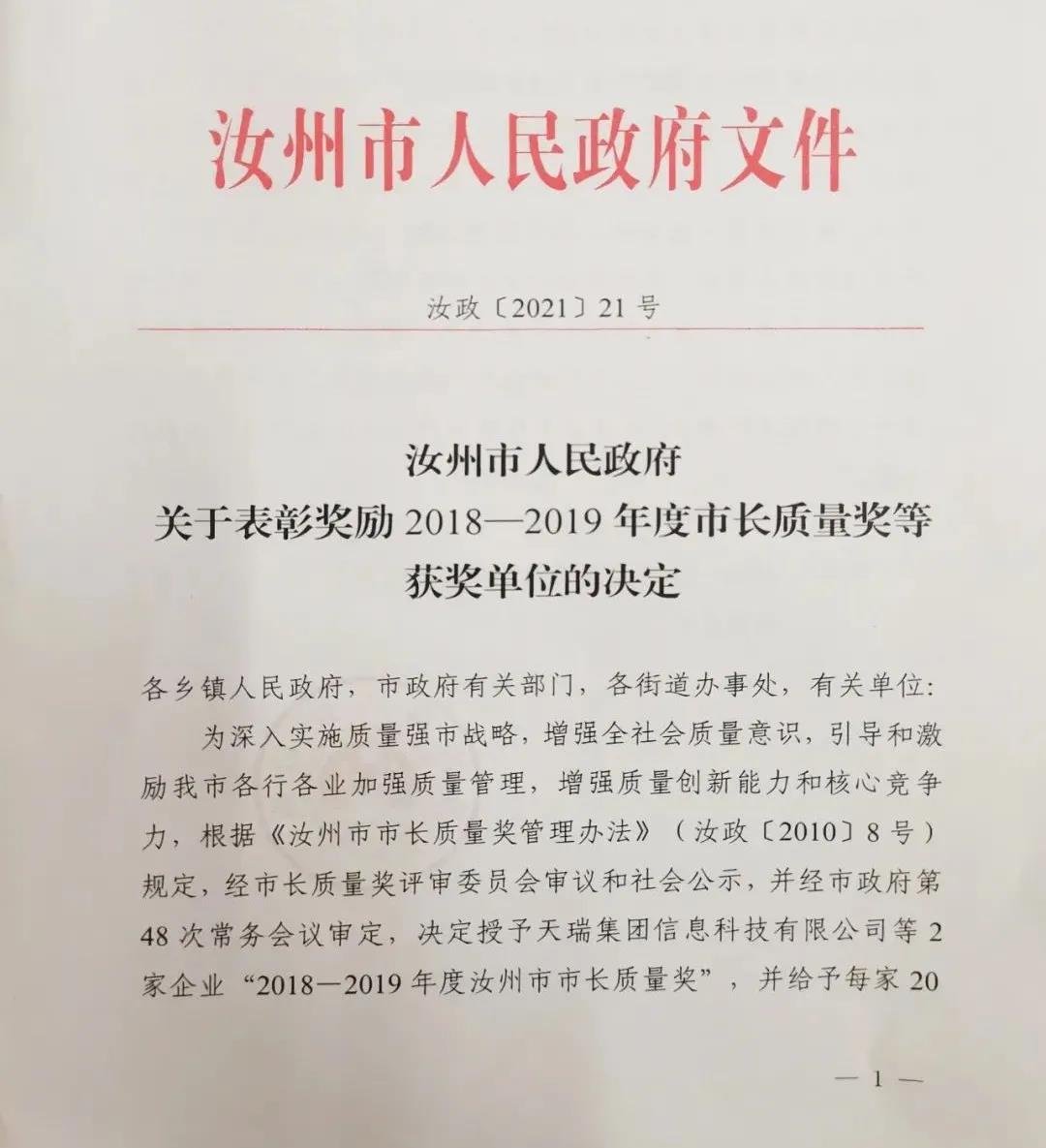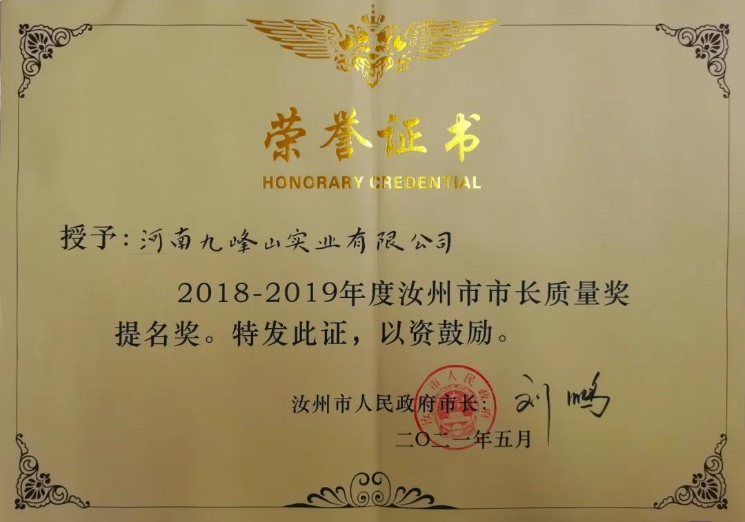 5月13日,汝州市人民政府印發(fā)《汝州市人民政府關(guān)于表彰獎勵2018-2019年度市長質(zhì)量獎等獲獎單位的決定》(以下簡稱決定),決定授予汝州市九峰山實業(yè)有限公司等五家單位“汝州市市長質(zhì)量獎提名獎”。