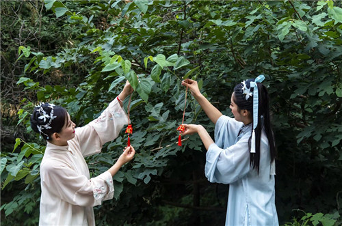 端午節(jié)期間, 五龍口景區(qū)下凡“七仙女”行走在景區(qū)的各個(gè)地方,隨時(shí)隨地與你互動(dòng),行萬福禮、分發(fā)粽子、贈(zèng)送香囊……七仙女還帶來了靈丹妙藥,在游客中心,為每個(gè)孩子的額頭點(diǎn)上雄黃酒,有解毒、辟邪,使孩子健康長命之意。