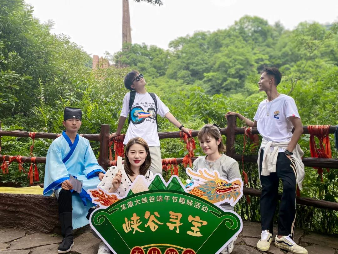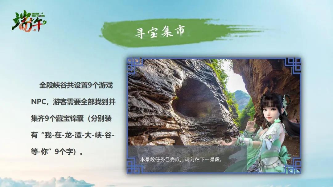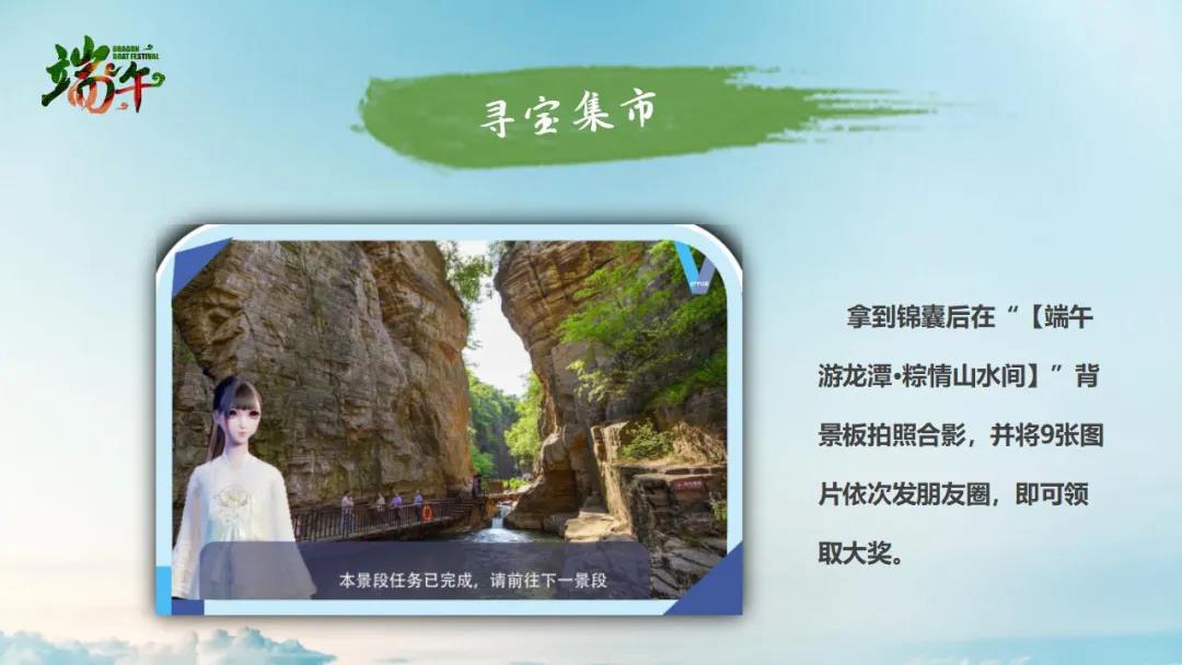 活動(dòng)規(guī)則:游客可在青龍?zhí)丁⒑邶執(zhí)、王母池、壺穴谷、花瓶峽、水往高處流、?菔癄、仙女出浴、天碑觀景臺共9個(gè)景點(diǎn)尋寶。每個(gè)景點(diǎn)均有一個(gè)持寶人,找到持寶人,并完成一個(gè)小任務(wù),即可領(lǐng)取寶藏錦囊。集齊9個(gè)藏寶錦囊(分別裝有“我-在-龍-潭-大-峽- 谷-等-你”9個(gè)字),游客本人在每個(gè)景點(diǎn)分別拿著錦囊里的字,與“【端午游龍?zhí)?middot;粽情山水間】”背景板拍照合影,并將9張圖片依次發(fā)朋友圈,即可領(lǐng)取大獎(jiǎng)。