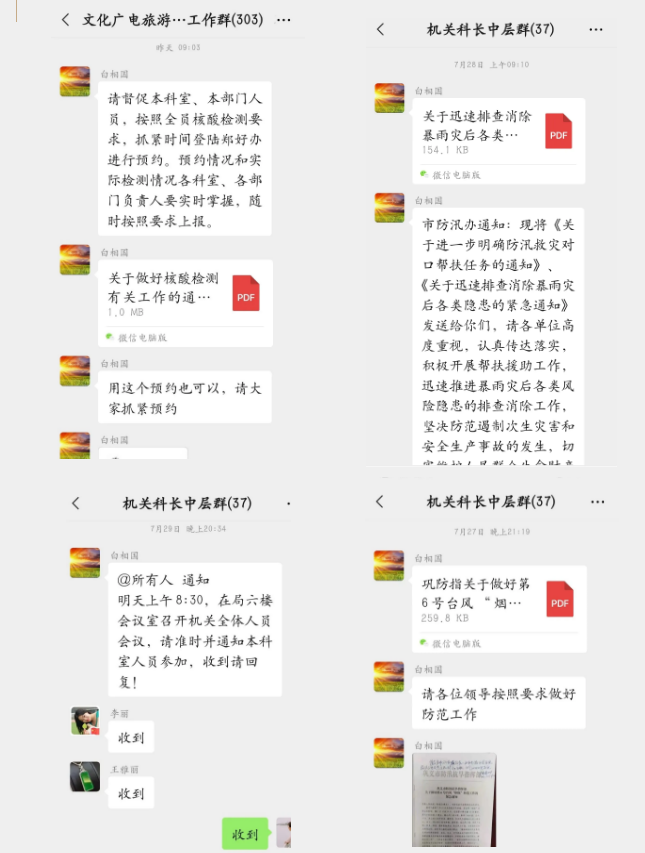 辦公室作為一個單位的綜合服務(wù)部門,承擔(dān)著上傳下達(dá)、多方溝通的職責(zé),辦公室主任既是單位的協(xié)調(diào)員,又是戰(zhàn)斗員,白相國同志因傷雖不能親自到前線作戰(zhàn),依然通過工作群協(xié)調(diào)局各項(xiàng)工作。