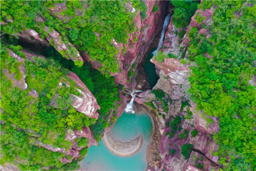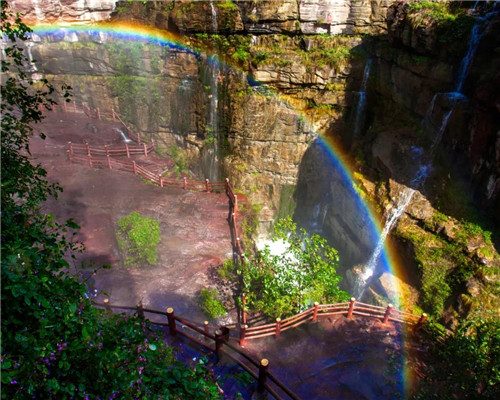 紅色的崖壁、碧綠的湖水、白練的瀑布、彩潭奇石,群瀑爭(zhēng)寵,各展英姿。