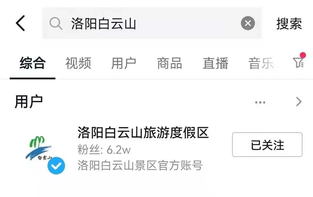 2.在搜索框內(nèi)輸入“洛陽白云山”后,點擊關(guān)注;